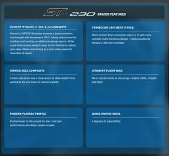 The Mizuno ST-Z 230 Driver features a balanced toe/heel carbon composite construction with deep central back weight – for a spin efficient, straight-line ball flight. Built upon the 2nd generation of Mizuno’s Forged SAT2041 Beta Ti face – for potent ball speeds and consistent performance over time.